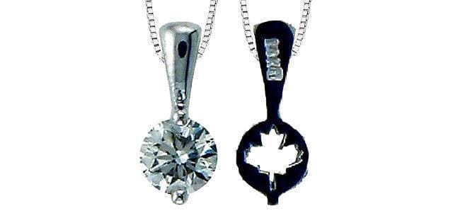 10 Karat White Gold Canadian Diamond Solitaire Pendant Necklace. 0.14 Carat Total Diamond Weight. This pendant comes with an 18 inch 10K white gold chain as shown. Alternate chain length, weight, or style options are available.