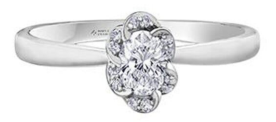 This 18 Karat White Gold engagement ring features a Canadian diamond, set in a delicate halo design with plain shoulders. The central oval-shaped diamond is complemented by a halo of sparkling accent diamonds, adding brilliance to the piece. With a timeless design and a touch of elegance, this ring is perfect for a memorable proposal. Customization is available if you prefer a different colour or karat of gold - please contact us, and we will be happy to assist.