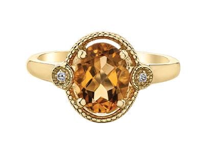 This elegant 10 Karat Yellow Gold ring features a captivating oval-shaped citrine at its center. The solitaire gemstone is beautifully enhanced by delicate diamond accents, adding a touch of sparkle to its classic design. The ring's sophisticated setting and warm yellow gold create a luxurious look, perfect for any occasion. Whether worn alone or stacked with other rings, this piece makes a refined addition to any jewelry collection.