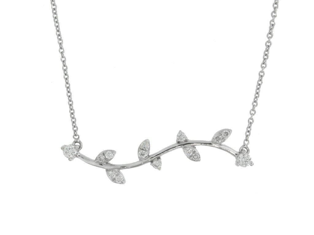 This charming 10 karat white gold pendant necklace features multiple round brilliant cut diamonds arranged in a delicate branch design. The pendant showcases leaves adorned with sparkling diamonds, creating an elegant and nature-inspired look. Measuring 7.2mm in height and 30.9mm in width, this piece is complemented by a 10K white gold chain, offering a complete and stylish accessory. The whimsical design and shimmering diamonds make this pendant a delightful addition, perfect for adding a touch of natural beauty to any ensemble.