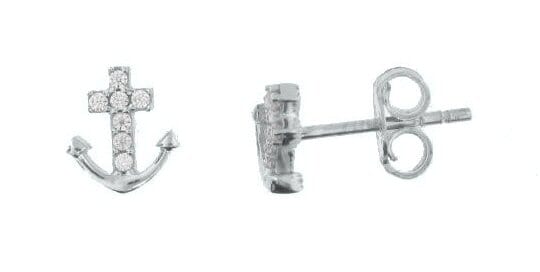 White Gold Cubic Zirconia Stud Earrings Cross Anchor