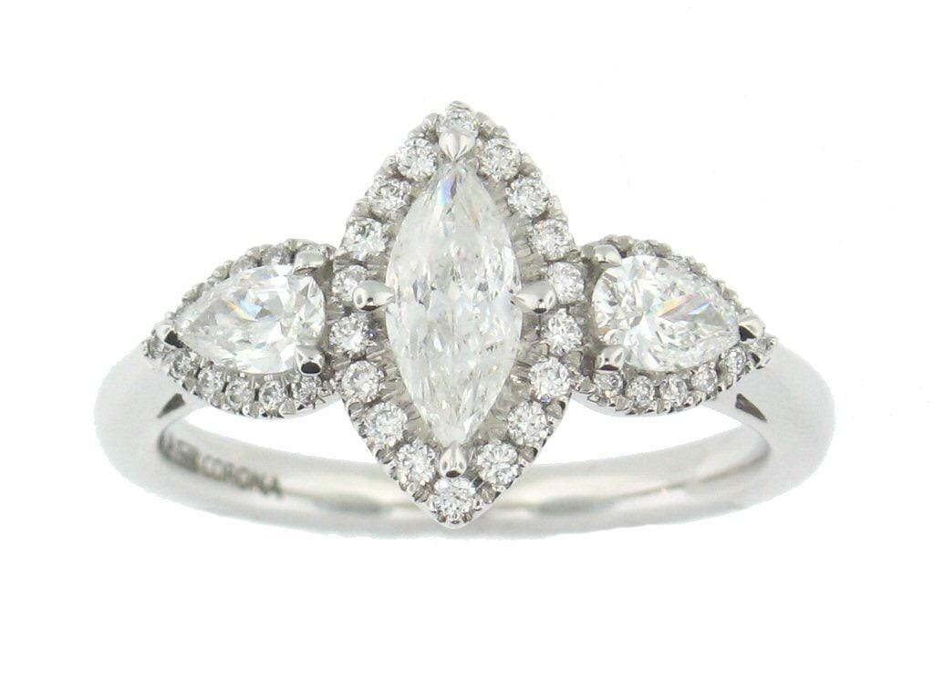 This stunning 18 Karat White Gold engagement ring showcases a marquise-shaped Canadian diamond at its centre, flanked by two pear-shaped diamonds, creating an elegant three-stone design. A delicate halo of diamonds surrounds each stone, enhancing their brilliance and adding an exquisite touch. The combination of the marquise centre and pear-shaped sides brings a unique flair to this classic piece. Ideal for a timeless proposal, this ring is also customizable to suit your preferences, whether you wish to alter the diamond shape, size, or metal type.