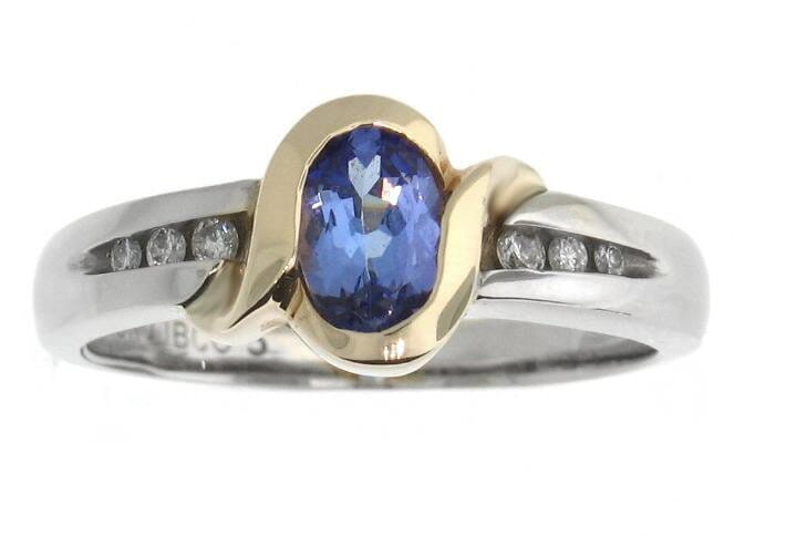 10 Karat White Gold, Yellow Gold Accent Tanzanite, Diamond Ring. 0.09 Carat Total Diamond Weight.
