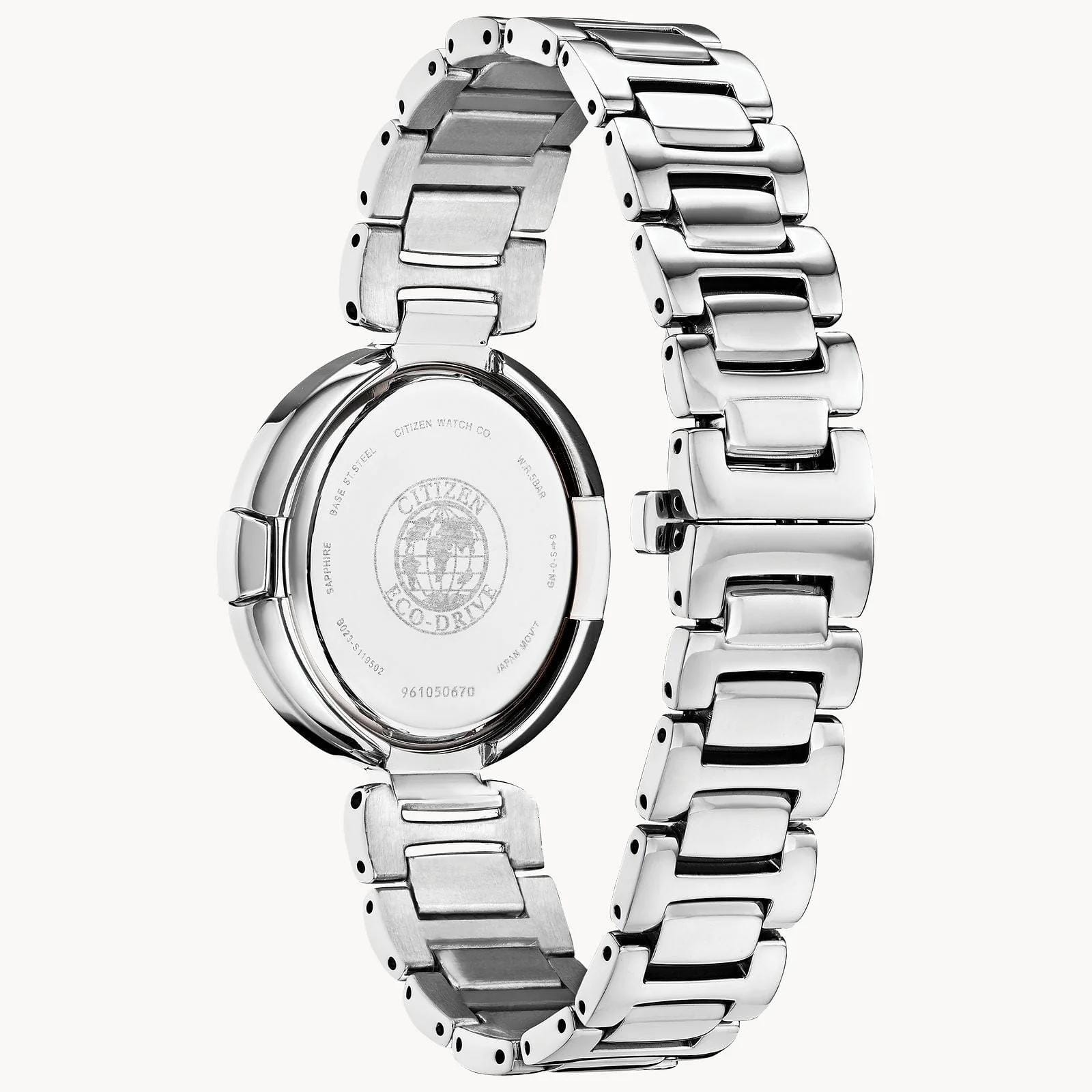 Citizen Ladies Silver Tone Swarovski Crystal, Sapphire Crystal, 50m 5ATM Water Resistant, Mother of Pearl Dial Eco-Drive Watch - CITIZEN takes ladies to a new modern standard with the CITIZEN Capella collection. Feminine curves, uninterrupted design and technical expertise are all showcased in these original timepieces. A diamond watch in stainless steel with a white Mother-of-Pearl and integrated crown, creating a seamless construction. Featuring our Eco-Drive technology – powered by light, any light. Never needs a battery. Caliber number B023.