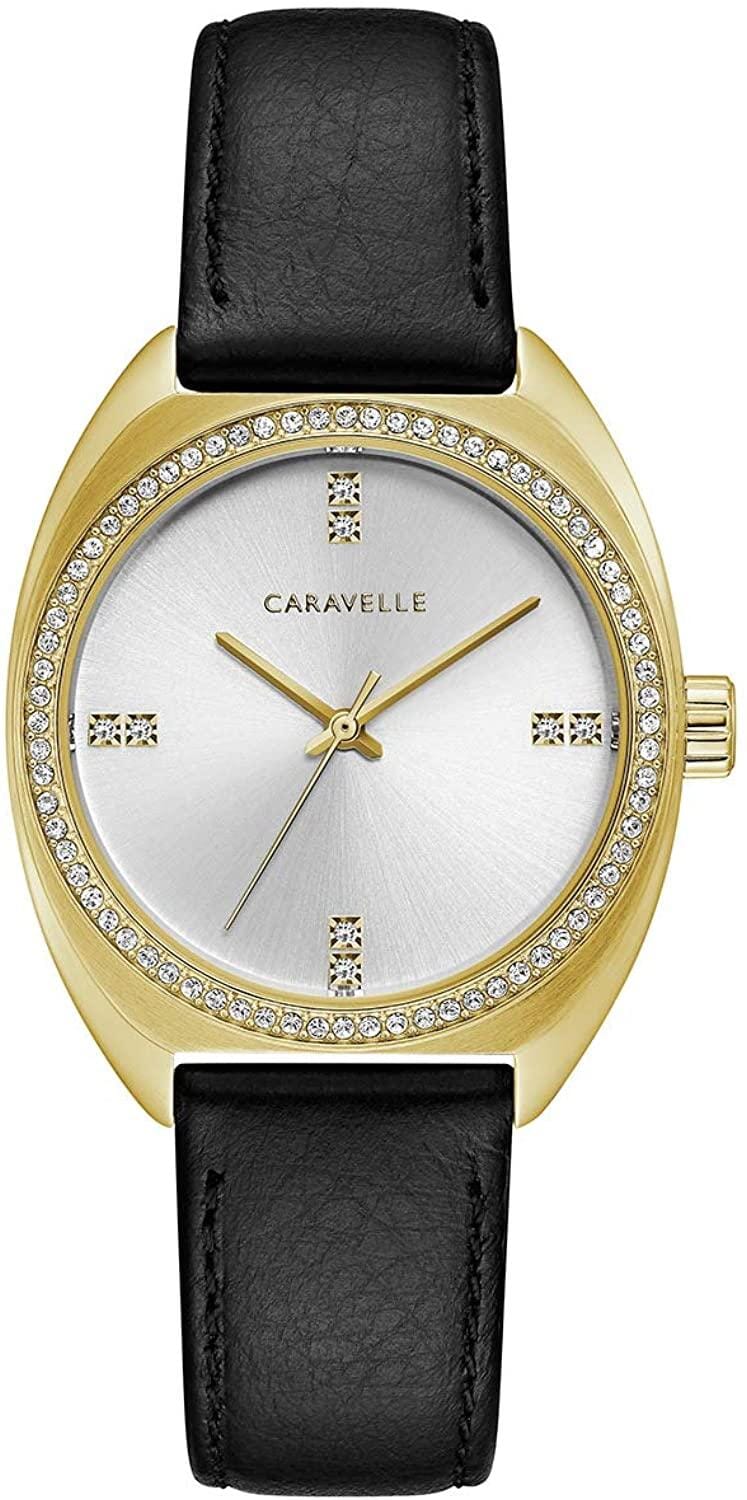 Caravelle New York Ladies Gold Tone, Black, Leather Strap Swarovski Crystal, 30m 3ATM Water Resistant Quartz Watch - Domed Mineral Crystal