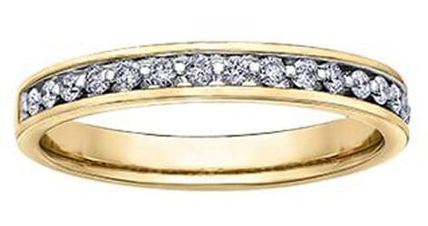 10 Karat Yellow Gold, White Gold Accent Diamond Band. 0.15 Carat Total Diamond Weight.