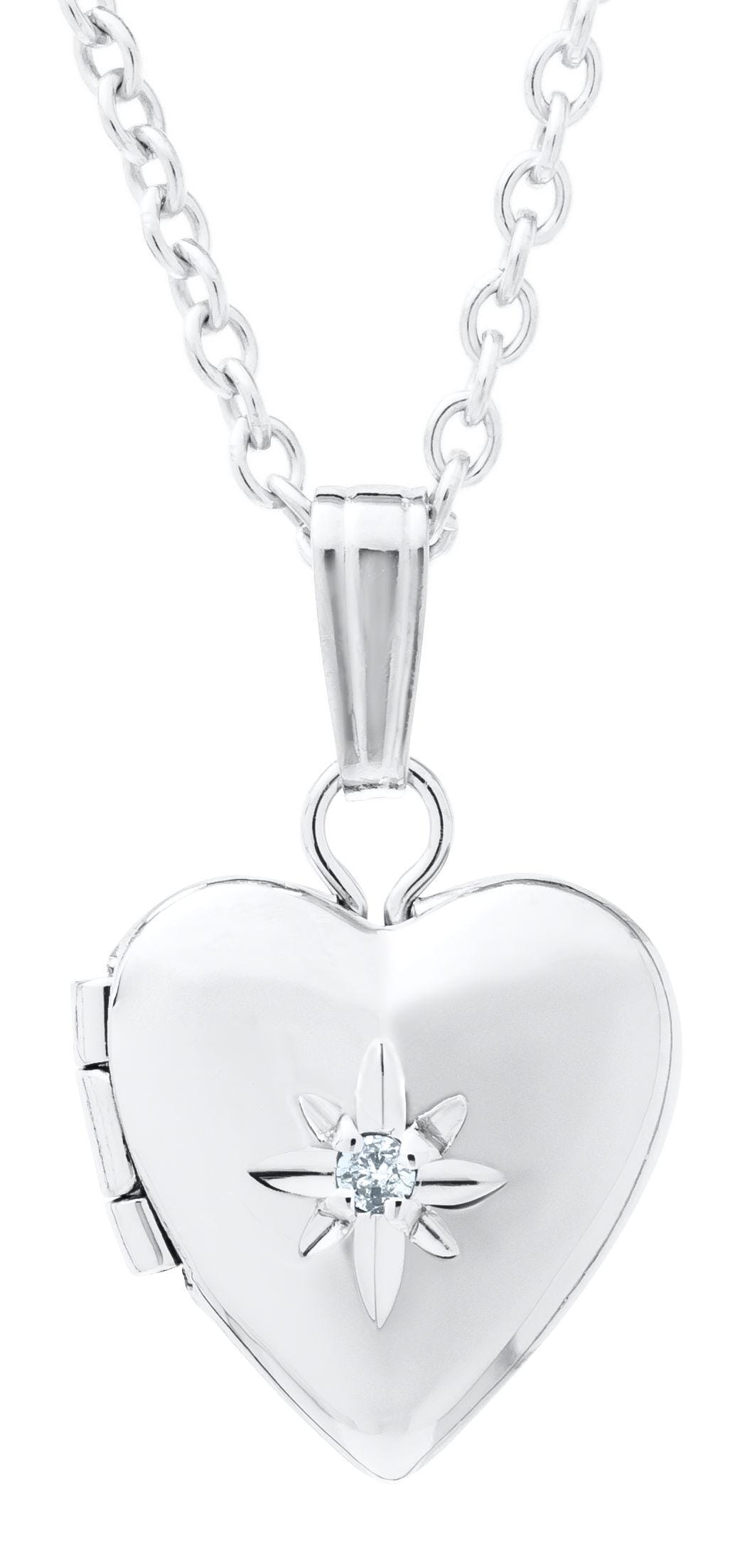Crafted in elegant Sterling Silver, this heart locket pendant features a delicate diamond at its centre, adding a touch of sparkle to this timeless piece. The locket, measuring 16.00mm in height and 10.00mm in width, is perfect for storing a small photo or keepsake, making it a cherished gift for a child. This pendant is paired with a 13-inch sterling silver chain, designed to sit comfortably around the neck. The simple yet classic design of this locket, highlighted by its central diamond accent, ensures it will be treasured for years to come.