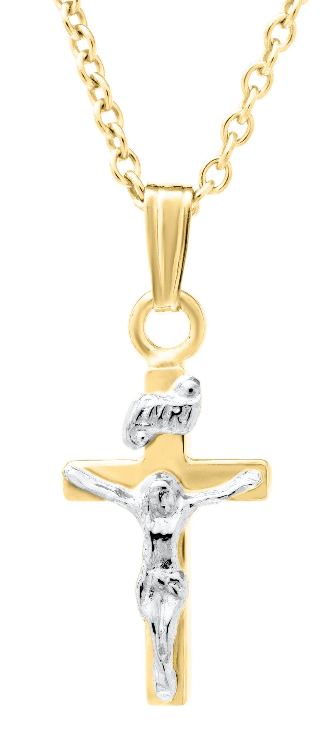 14K Yellow Gold Filled Baby / Childrens Crucifix Cross Pendant Necklace.. Gold-filled jewellery is created by bonding a thick layer of solid gold to a durable base metal - ensuring lasting beauty and wearability. This pendant comes with a 13 inch 14K gold-filled chain as shown. Alternate chain length, weight, or style options are available.