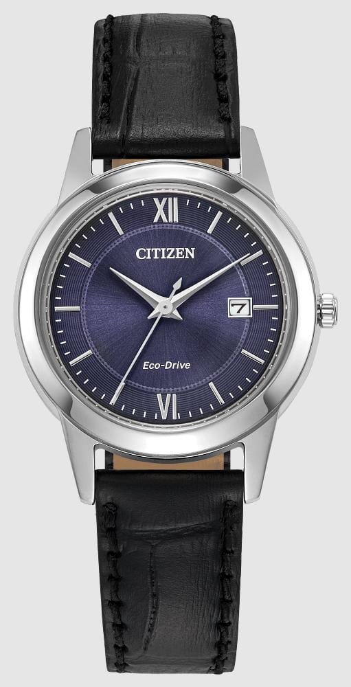 Citizen Ladies Leather Strap Date Only Eco-Drive Watch - Classic lines and a simple silhouette define the newest addition to the Classic collection. This vintage-inspired timepiece features a silver-tone stainless steel case, a striking blue 3-hand dial with a date function, and a rich black leather strap with buckle closure. Sustainably powered by any light with Eco-Drive technology and never needs a battery.