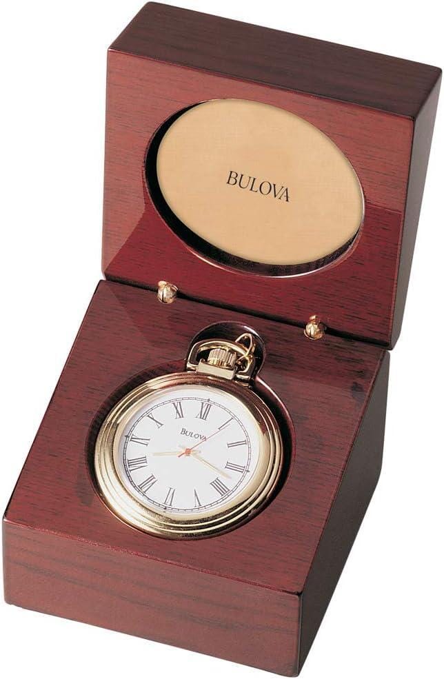 Bulova Gents Gold Tone Quartz Pocket Watch Solid hardwood presentation box, high-gloss finish over mahogany stain. Removable polished gold-tone pocket watch and chain with engravable back. Clear protective lens. Round engraving plate for case. Requires (1) SR626SW battery, included. Round engraving plate included: 1.75", 4.4cm