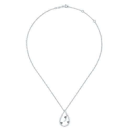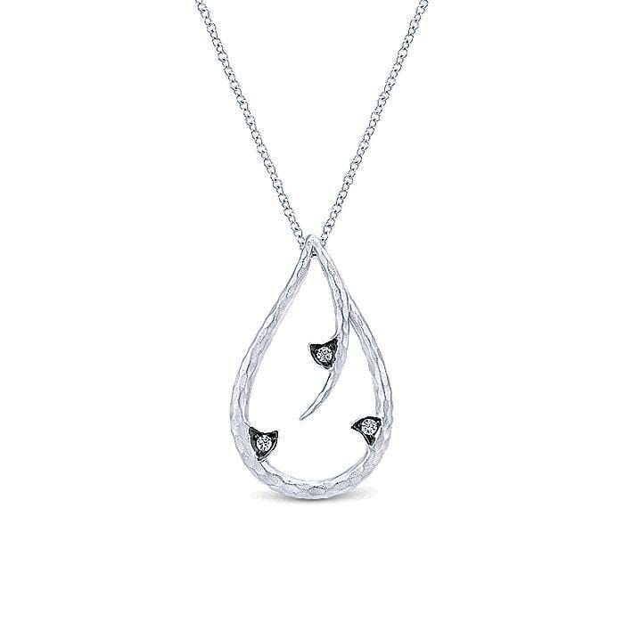 This elegant sterling silver teardrop pendant from Gabriel & Co. is adorned with sparkling white sapphires, adding a touch of refined beauty to the design. The intricate detailing and the gentle curves of the teardrop frame create a sophisticated and timeless piece. This pendant includes an 18-inch sterling silver chain, with options for alternate chain lengths, weights, or styles available. Measuring 27.3mm in height and 16.3mm in width, this pendant is a versatile accessory that can elevate any outfit, making it an exquisite addition to your jewellery collection.