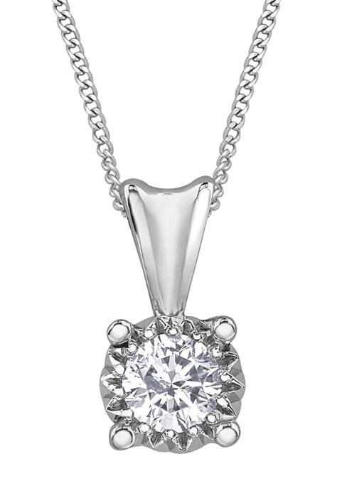 10 Karat White Gold Diamond Solitaire Pendant Necklace. 0.07 Carat Total Diamond Weight. This pendant comes with an 18 inch 10K white gold chain as shown. Alternate chain length, weight, or style options are available.