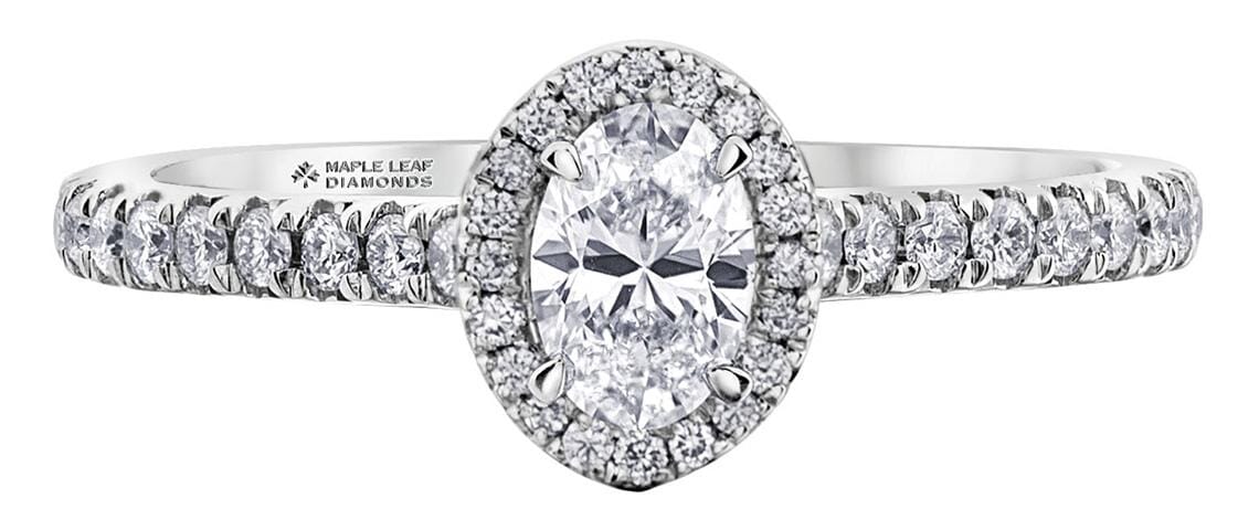 This 18 Karat White Gold engagement ring showcases a stunning Canadian diamond, featuring an oval-shaped centre stone embraced by a delicate halo of sparkling diamonds. The diamond shoulders add an extra touch of brilliance, highlighting the centre diamond’s radiance. This ring is perfect for those looking to celebrate a special moment with timeless style. If you prefer a different colour or karat of gold, please contact us - we're here to help!