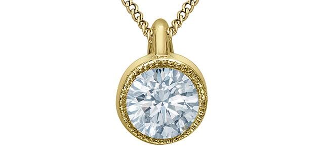10 Karat Yellow Gold Signature Lab Grown Diamond Solitaire Pendant Necklace. 0.30 Carat Center Total Diamond Weight. This pendant comes with an 18 inch 10K yellow gold chain as shown. Alternate chain length, weight, or style options are available.