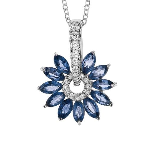 Embrace elegance with this 14 Karat White Gold necklace, showcasing a stunning blue sapphire pendant. The floral arrangement of sapphires radiates with deep hues, centered by a sparkling cluster of diamonds weighing a total of 0.11 carats. This necklace is a symphony of sophistication, designed to captivate and charm, making it an impeccable addition to any jewelry collection. Pendant Size: Height:16.52mm Width:13.22mm.