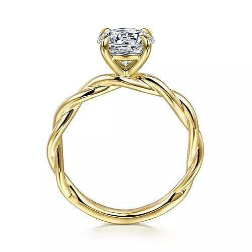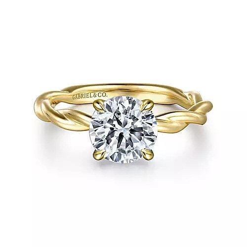 This stunning 14 Karat Yellow Gold Engagement Ring from Gabriel & Co. features our Signature brilliant cut lab-grown diamond at its center. The design is elegant and timeless, with a beautifully twisted band that adds a unique touch to the classic solitaire style. The ring is fully customizable, allowing you to select your preferred diamond shape, size, and even adjust the karat or colour of the gold. Whether you desire a different band style, or wish to explore a platinum setting, this ring can be tailored to match your personal taste and vision for your perfect engagement ring.